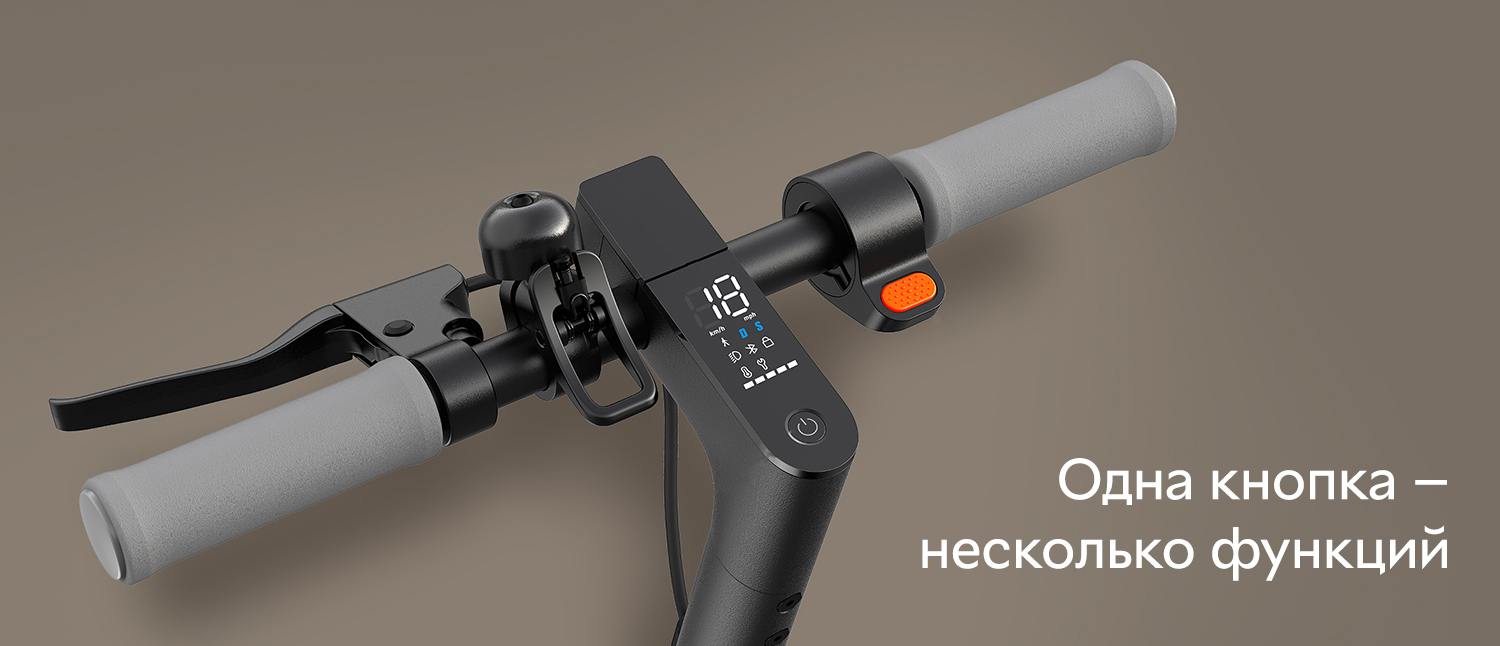- Интуитивно понятное управление: кнопка не только включает и выключает питание, она также может использоваться для переключения между скоростными режимами, а также для включения и выключения фар. Короткое нажатие на кнопку вкл/выкл включает самокат, трехсекундное нажатие на эту же кнопку его выключает. Короткое однократное нажатие включает и выключает ходовые огни. Переключение скоростей производится коротким двойным нажатием на кнопку вкл/выкл.
