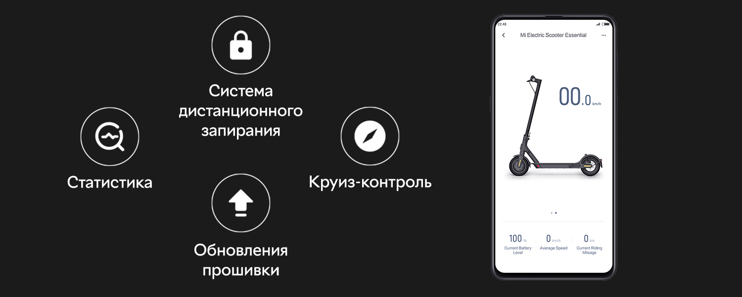 - Электросамокат Xiaomi Mi Essential через Bluetooth подключается к мобильному приложению, с помощью которого можно будет обновить прошивку самоката или включить блокиратор. В приложении также отображаются и такие данные, как например: пройденной расстояние, скорость и количество избыточной электроэнергии.