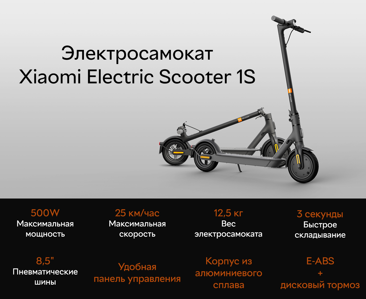 - Электросамокат Xiaomi Mi Scooter 1S представляет собой обновлённую версию, выпущенную через четыре года после дебюта очень популярного предшественника — Xiaomi Mi Electric Scooter. Главным изменением является новый интерактивный интерфейс на руле: на небольшом экране предоставляется информация о статусе, скорость в реальном времени и другие полезные данные. Xiaomi Mi Scooter 1S весит 12.5 кг. Он способен выдерживать нагрузку до 100 кг. Максимальная скорость составляет 25 км/ч, а ёмкости аккумулятора будет достаточно на 30 км. Самокат оснащен надежной тормозной системой, благодаря которой вы всегда в безопасности. Также предлагается три режима работы — экологичный энергосберегающий, нормальный и спортивный.