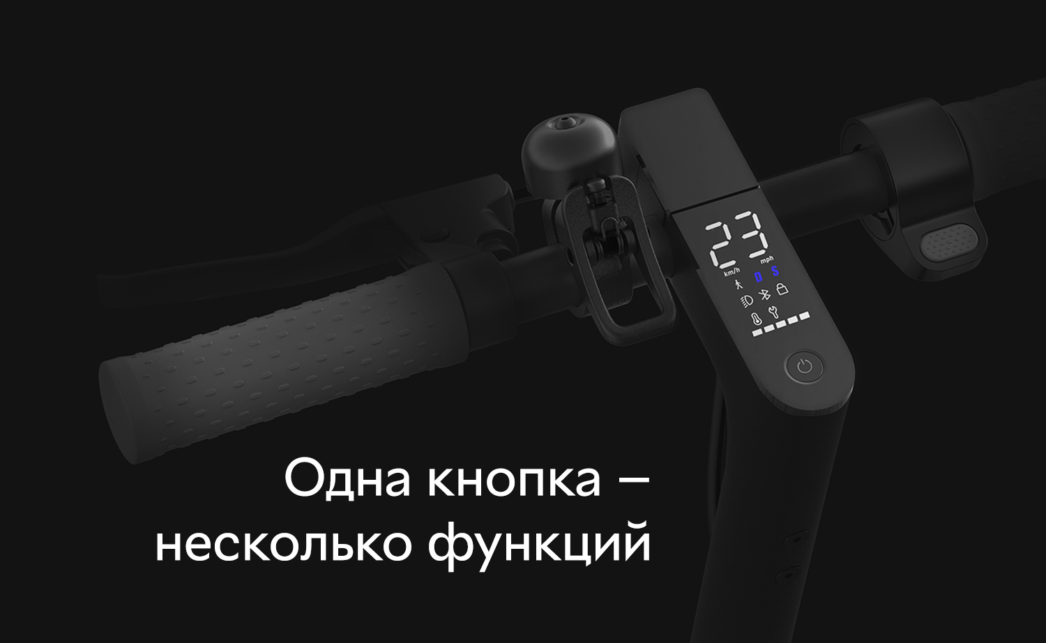 - Интуитивно понятное управление: кнопка не только включает и выключает питание, она также может использоваться для переключения между скоростными режимами, а также для включения и выключения фар. Короткое нажатие на кнопку вкл/выкл включает самокат, трехсекундное нажатие на эту же кнопку его выключает. Короткое однократное нажатие включает и выключает ходовые огни. Переключение скоростей производится коротким двойным нажатием на кнопку вкл/выкл.