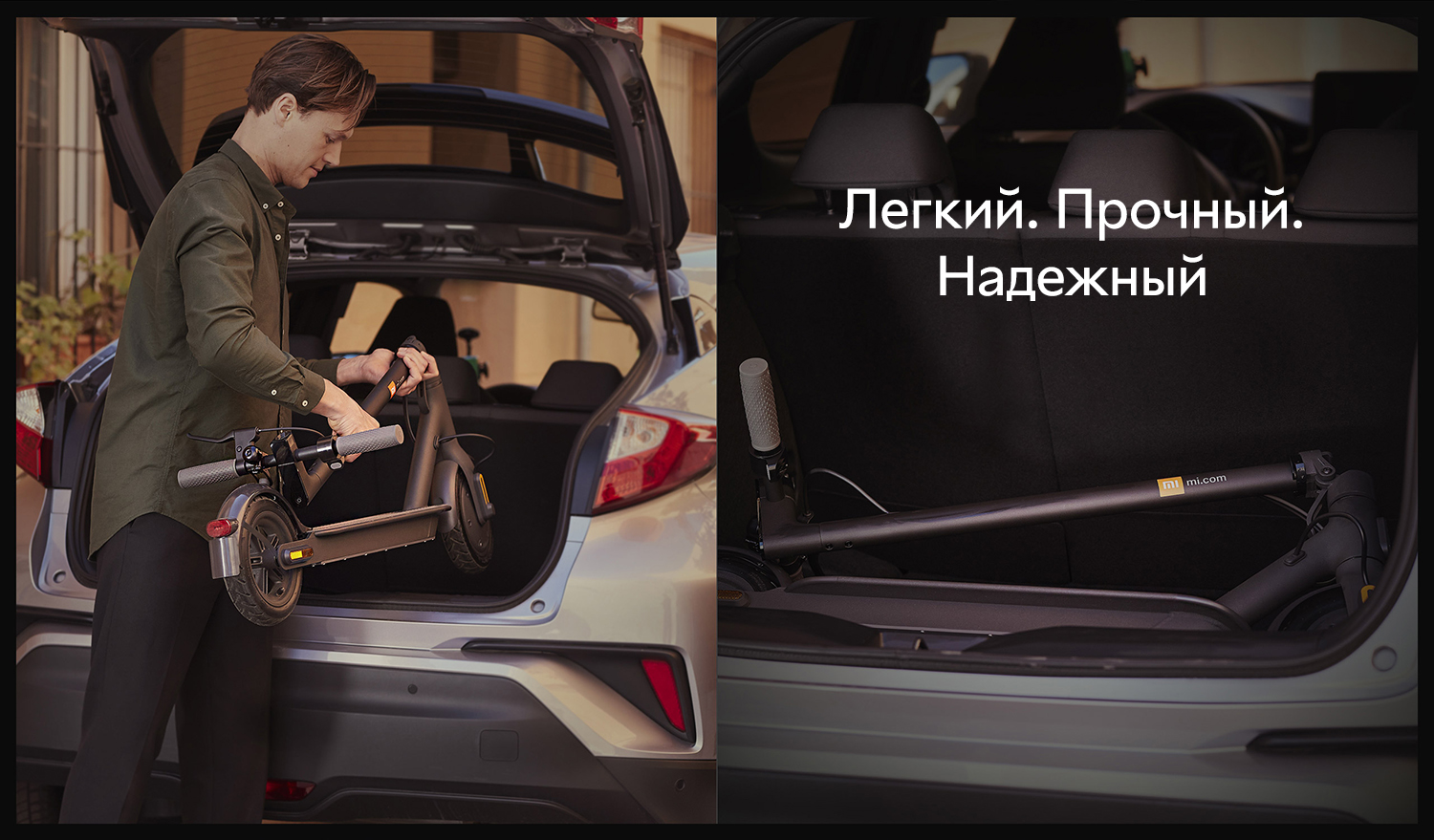 - Самокат складывается одним нажатием кнопки. Вам понадобится не больше 3 секунд. Легко помещается в багажник автомобиля и не занимает много места в квартире.