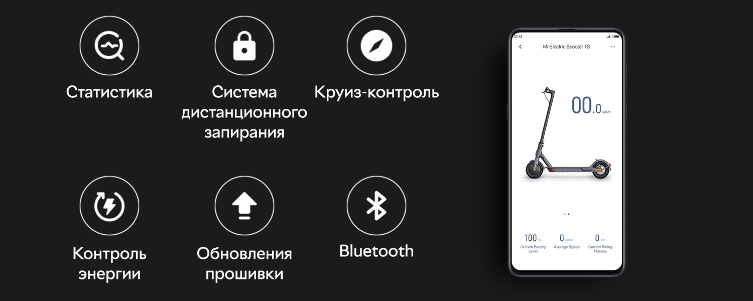 - Электросамокат Xiaomi Mi 1S через Bluetooth подключается к мобильному приложению, с помощью которого можно будет обновить прошивку самоката или включить блокиратор. В приложении также отображаются и такие данные, как например: пройденной расстояние, скорость и количество избыточной электроэнергии.