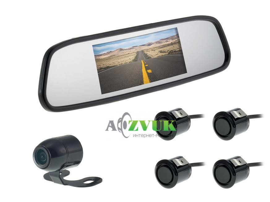 - Четырёхдатчиковый парковочный радар c камерой и 4,3" монитором встроенным в зеркало заднего вида; универсальное крепление поверх штатного зеркала; система цветности камеры - PAL;