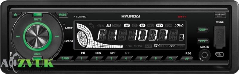 Hyundai H-CDM-8017. Типорозмір: 1 DIN. Підтримка карток пам'яті. Передня панель, що знімається. Аудіо вход на передній панелі. Вихід для сабвуферу Формати дисків CD-R. CD-RW. Функція CD-Text. USB-порт. Підсилювач.