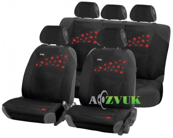 - Майки STRAWBERRIES будуть дарувати Вам завжди тільки позитивні емоції. Матеріал – тканина "Полісет", вставка з аплікацією. Дубльовані поролоном на сітці 3 мм. П'ять підголівників. Шість блискавок для розподілу заднього сидіння. Підходять для крісел з AIRBAG.