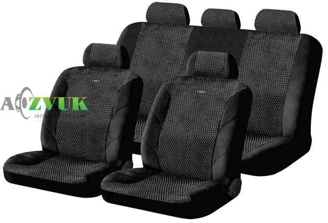 Універсальні чохли для автомобільних сидінь. Центральна частина – Велюр Букле, оздоблення – Велюр. Дубльовані поролоном на сітці. У комплекті п'ять підголівників. Шість блискавок для розподілу заднього сидіння. Розривна мембрана для крісел з AirBag. Кишені на спинках передніх сидінь.