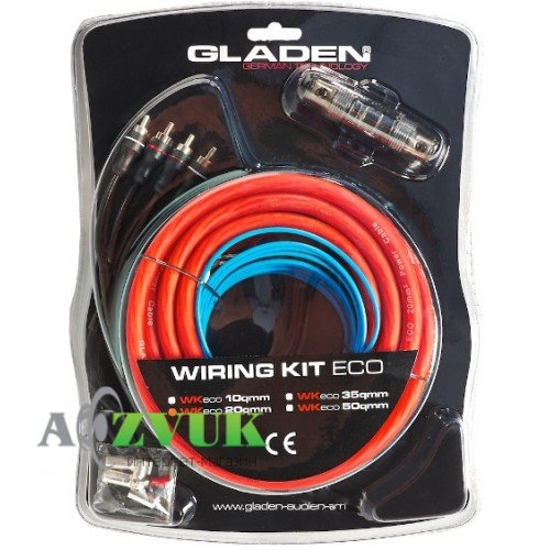 - Gladen ECO Line WK 20 - комплект (набір) для встановлення 2-х канального підсилювача. Силовий мідно-алюмінієвий провід 4AWG (5 м), міжблочний RCA-кабель (5 м), запобіжник 60A типу ANL.