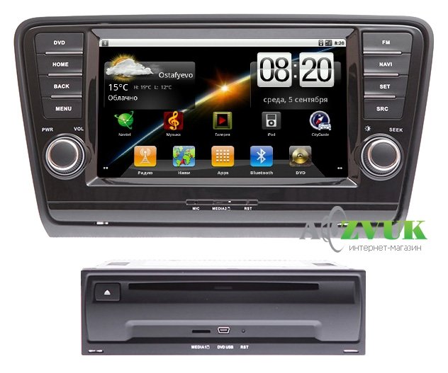- Штатний головний пристрій з навігацією на ОС Android AudioSources ANS-840A для автомобілів Skoda Octavia A7 має високоякісний сенсорний екран з роздільною здатністю (800x480 пікселів), автомобільний гучний зв'язок (Hands Free), FM-модулем високої чутливості, програвач з підтримкою більшості , FLAC, MP3, MPEG4, AVI, MPG2 і т.д.), потужний вбудований підсилювач.