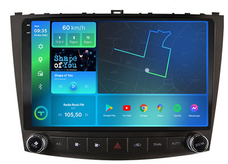 - Цифрова автомагнітола, дизайн якої був повністю розроблений під особливості салону вашого автомобіля, працює на ОС Android, підтримує інтернет-підключення Wi-Fi, 3G/4G, систему контролю тиску в шинах TPMS, систему кругово огляну 360, а також Carplay/Android Auto та відповідає найвищим вимогам поціновувачів музики під час поїздок на авто.