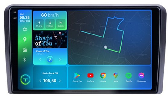 - Цифрова автомагнітола, дизайн якої був повністю розроблений під особливості салону вашого автомобіля, працює на ОС Android, підтримує інтернет-підключення Wi-Fi, 3G/4G, систему контролю тиску в шинах TPMS, систему кругово огляну 360, а також Carplay/Android Auto та відповідає найвищим вимогам поціновувачів музики під час поїздок на авто.