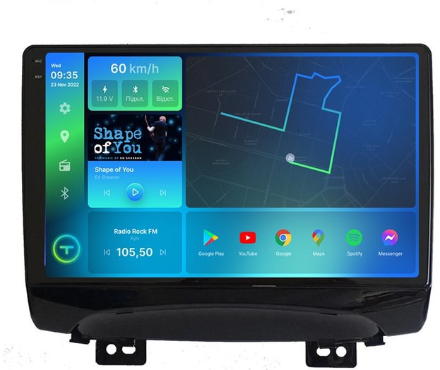 - Цифрова автомагнітола, дизайн якої був повністю розроблений під особливості салону вашого автомобіля, працює на ОС Android, підтримує інтернет-підключення Wi-Fi, 3G/4G, систему контролю тиску в шинах TPMS, систему кругово огляну 360, а також Carplay/Android Auto та відповідає найвищим вимогам поціновувачів музики під час поїздок на авто.
