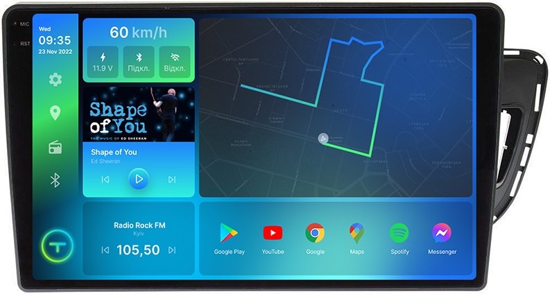 - Цифрова автомагнітола, дизайн якої був повністю розроблений під особливості салону вашого автомобіля, працює на ОС Android, підтримує інтернет-підключення Wi-Fi, 3G/4G, систему контролю тиску в шинах TPMS, систему кругово огляну 360, а також Carplay/Android Auto та відповідає найвищим вимогам поціновувачів музики під час поїздок на авто.