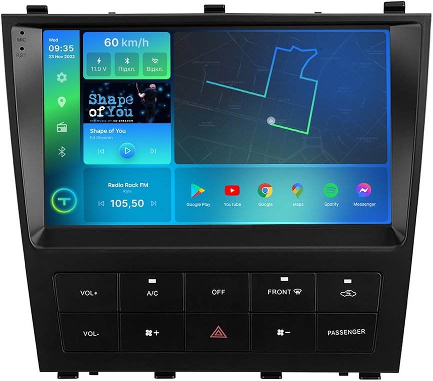 - Цифрова автомагнітола, дизайн якої був повністю розроблений під особливості салону вашого автомобіля, працює на ОС Android, підтримує інтернет-підключення Wi-Fi, 3G/4G, систему контролю тиску в шинах TPMS, систему кругово огляну 360, а також Carplay/Android Auto та відповідає найвищим вимогам поціновувачів музики під час поїздок на авто.