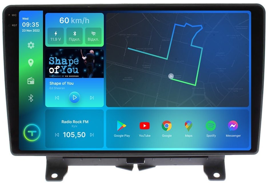 - Цифрова автомагнітола, дизайн якої був повністю розроблений під особливості салону вашого автомобіля, працює на ОС Android, підтримує інтернет-підключення Wi-Fi, 3G/4G, систему контролю тиску в шинах TPMS, систему кругово огляну 360, а також Carplay/Android Auto та відповідає найвищим вимогам поціновувачів музики під час поїздок на авто.