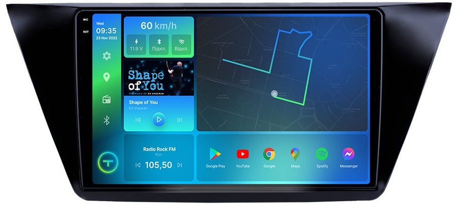 - Цифрова автомагнітола, дизайн якої був повністю розроблений під особливості салону вашого автомобіля, працює на ОС Android, підтримує інтернет-підключення Wi-Fi, 3G/4G, систему контролю тиску в шинах TPMS, систему кругово огляну 360, а також Carplay/Android Auto та відповідає найвищим вимогам поціновувачів музики під час поїздок на авто.