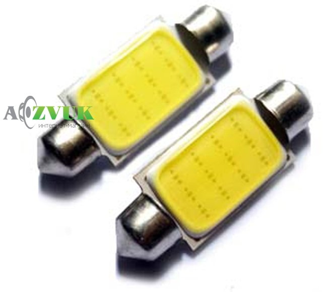 - Джерело світла світлодіоди COB Source. Вони виконані за новою технологією, де всередині одного діода розміщено і запитано безліч кристалів, в даному випадку 9. Особливістю такої структури є те, що загальна підкладка відводить більше тепла, тим самим дають більше люменів з квадратного сантиметра. Робоча напруга 12 Ст. Сила світлового потоку 170 Лм. Колірна температура біла, з блакитним відтінком, 6000К. Лампочки Festoon 36 двоцокольні, довжиною 36 мм та діаметром 8.5 мм, які найпоширеніші. Розміри стандартні, а світлодіоди розташовані там де в галогеновій нитці розжарювання. Кут розсіювання світла 120 градусів. Діапазон робочих температур від -30°С до +85°С.