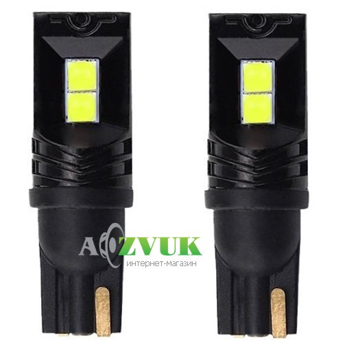 - Джерелом світла є потужні світлодіоди LED 3030 chips, вони виконані за новою технологією. У даній моделі лампочок розташовано два світлодіоди у вигляді смужок, які випромінюють чисте яскраве світло, колірною температурою 6000 К, з блакитним відтінком. Номінальна напруга 12 В. Цоколь лампочки T10 – без цокольні, роль цоколя виконує патрон, два контакти якого притискаються до провідників. Лампочка з Canbus для обману бортових систем, які контролюють роботу світлових приладів.